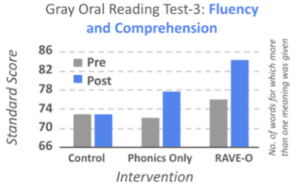 NICHD funded, RCT research found students receiving instruction in RAVE-O outperformed comparison groups in areas of decoding, vocabulary, and comprehension