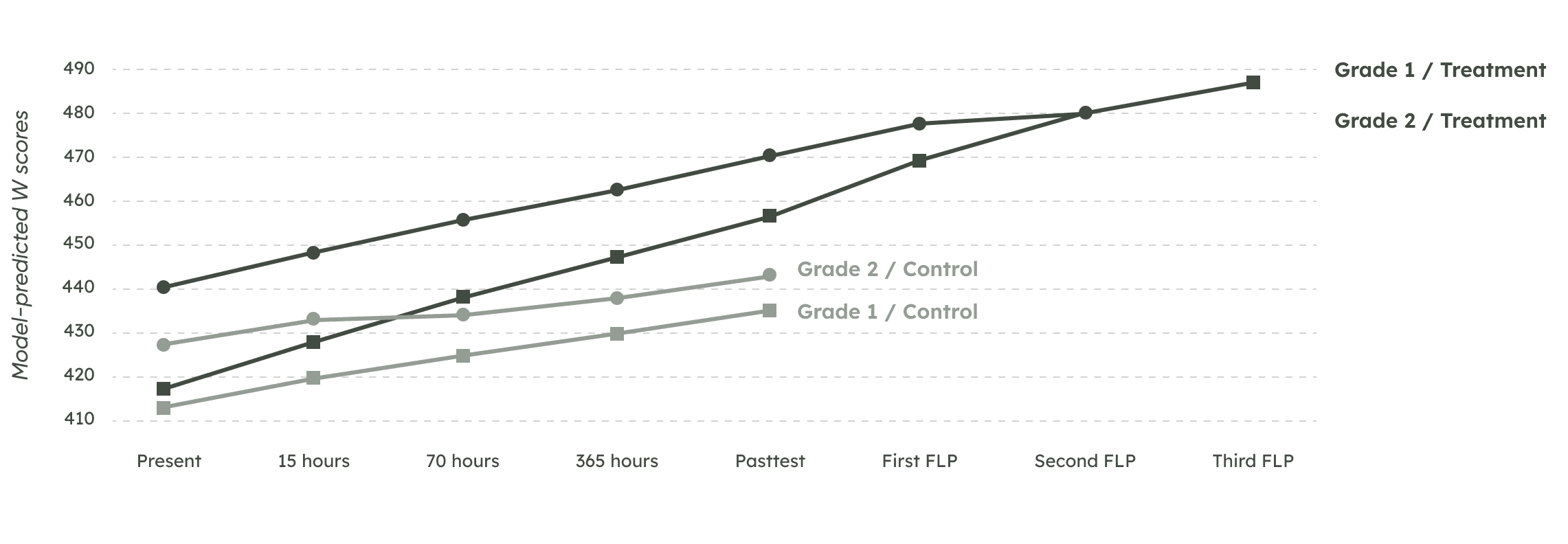 Model-predicted Woodcock Reading Test-Revised Passage Comperhension ( W scores) by grade and intervension Status)